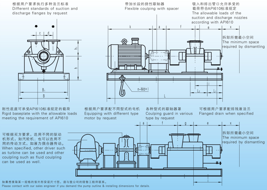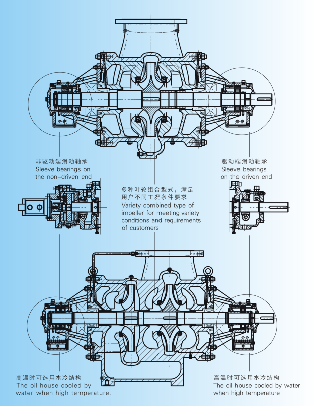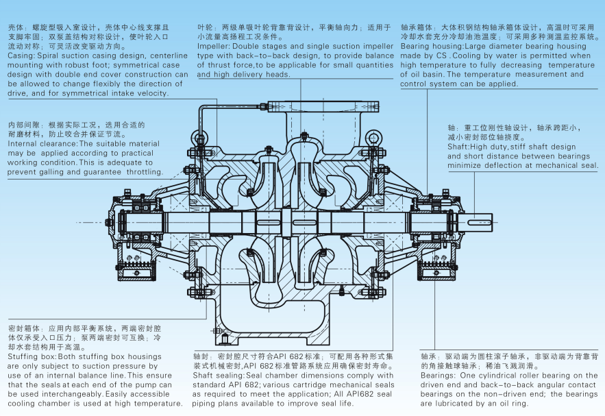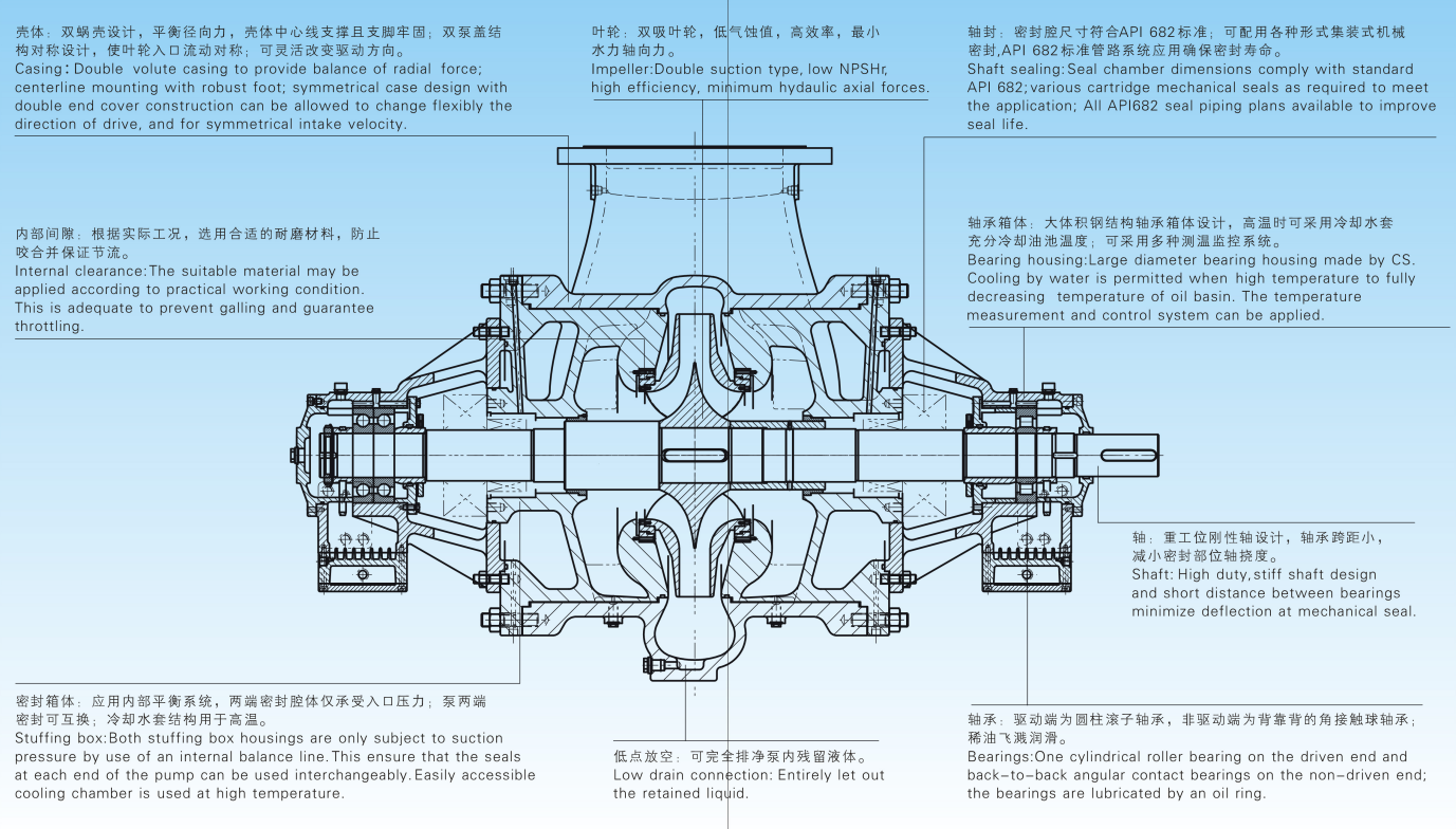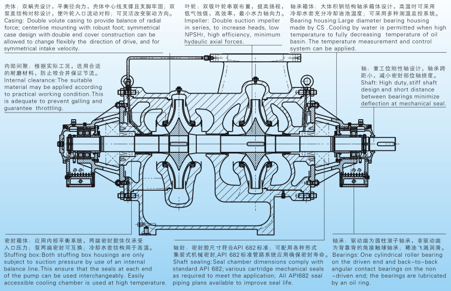 ◆泵壳:顶进顶出结构,管口载荷符合API610标准;径向剖分,中心支承,吸入泵盖对称分布。