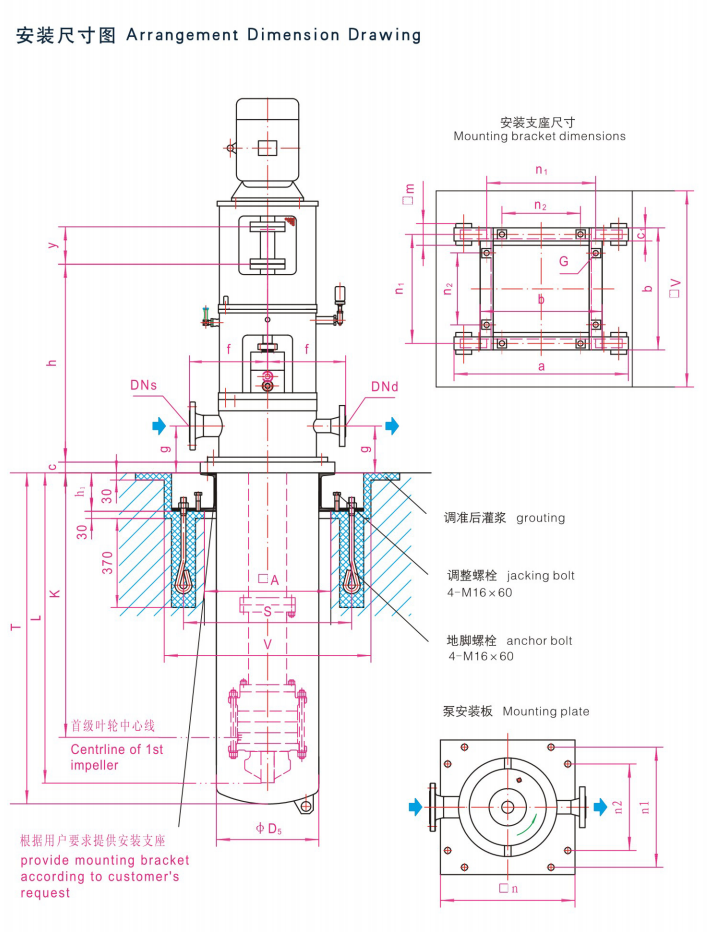 ■带筒袋的泵可安装在干坑中。外壳的长度以及泵的安装深度取决于对NPSH汽蚀性能的要求。可根据需要提供二次灌浆的安装支座。