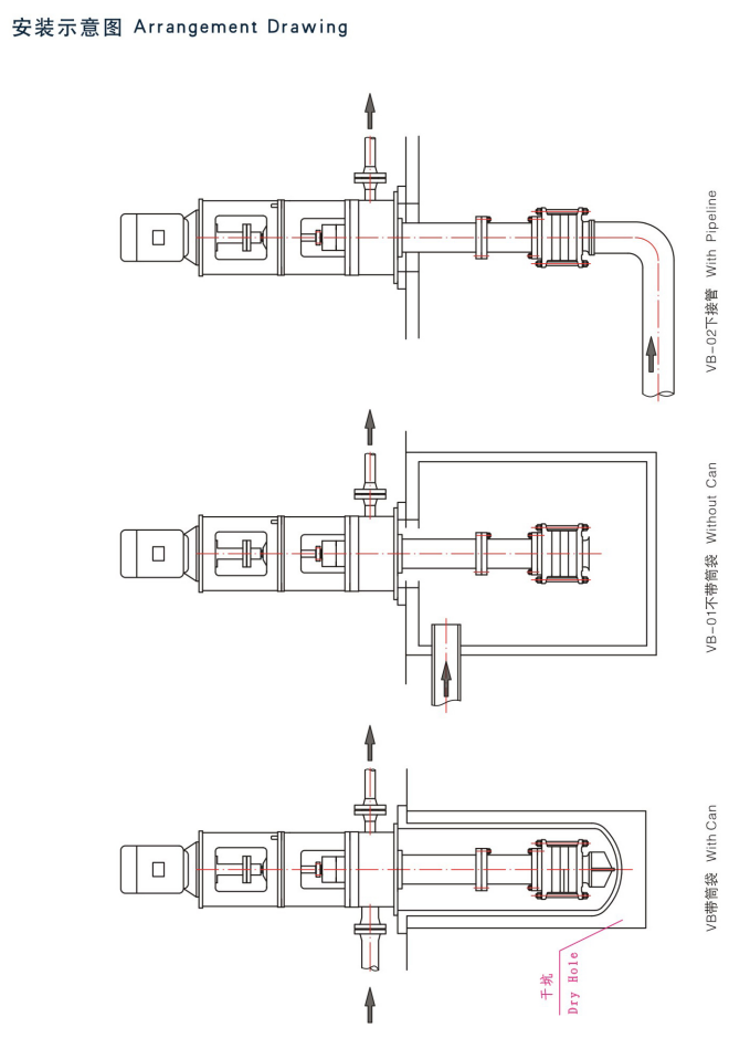 ■不带筒袋的泵(VB-01型式)可安装在容器上或者与管道法兰连接,可作为多级液下泵使用。泵与容器的安装采用法兰连接,适用于各种不同的法兰尺寸。