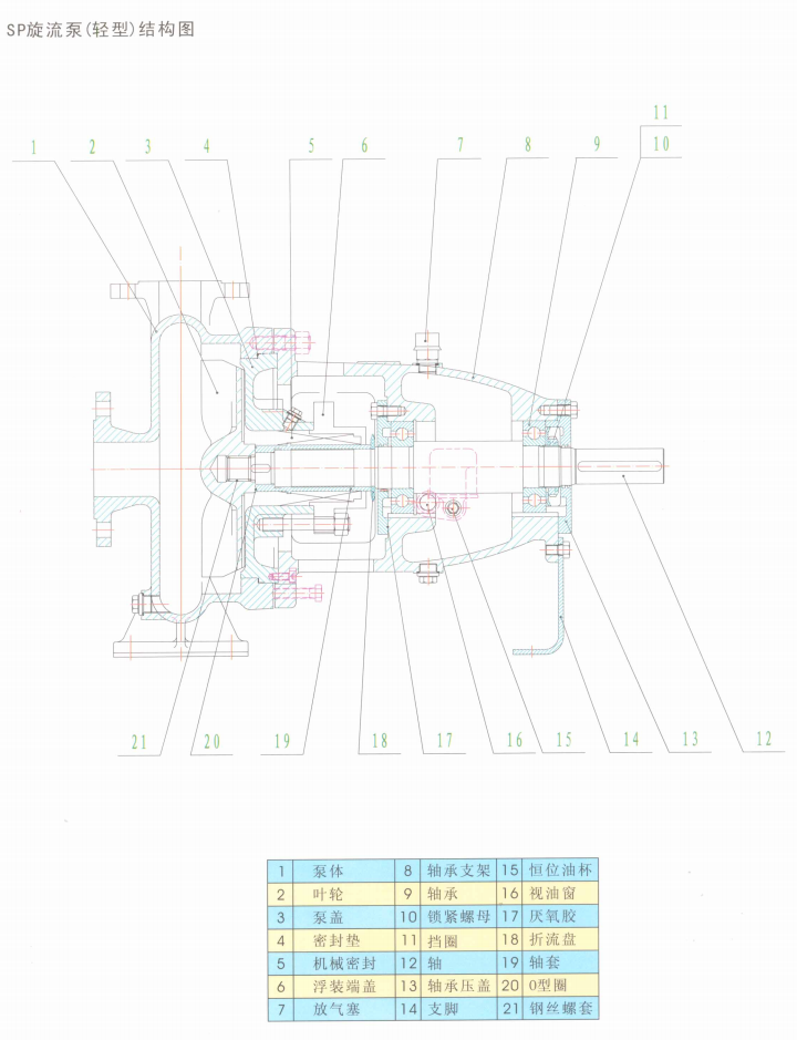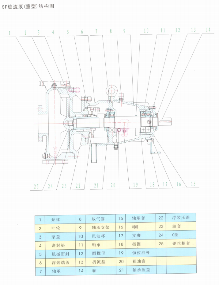 SP系列旋流泵是单级、单吸、卧式悬臂式离心泵,执行ISO13709标准。泵壳为脚支承结构。轴承采用油浴润滑,转子可轴向调节。叶轮采用螺纹连接,承载强度高,零件数量少,可靠性高。标准设计机械密封腔尺寸,适用于不同的专业密封厂产品。床优化设计的轴系转子系统,承载能力强,工作平稳,振动小,运转噪声低。过流部件的水力几何参数的优化组配设计,结合科学水力试验的修正,极大的提高了水力效率,比传统设计及现有国内产品平均高5%以上,达到国际先进水平。